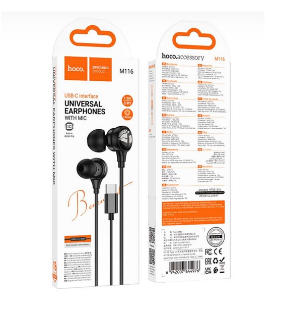 The HOCO M116 Type-C earphones provide clear sound and reliable performance for calls and music. Designed with an integrated microphone and ergonomic fit, they ensure comfort and convenience for daily use.