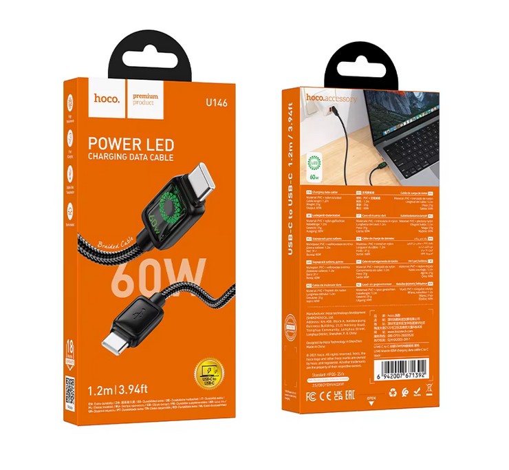 The HOCO U146 Type-C to Type-C cable supports fast charging up to 60W and high-speed data transfer. Designed for durability and efficiency, it ensures safe and stable charging for modern devices including smartphones, tablets, and laptops.