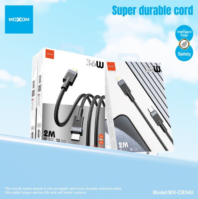 The MOXOM MX-CB340 delivers 36W fast charging for Apple devices using a Type-C to Lightning connection. Designed for efficiency and durability, it supports fast data syncing and reliable power delivery.