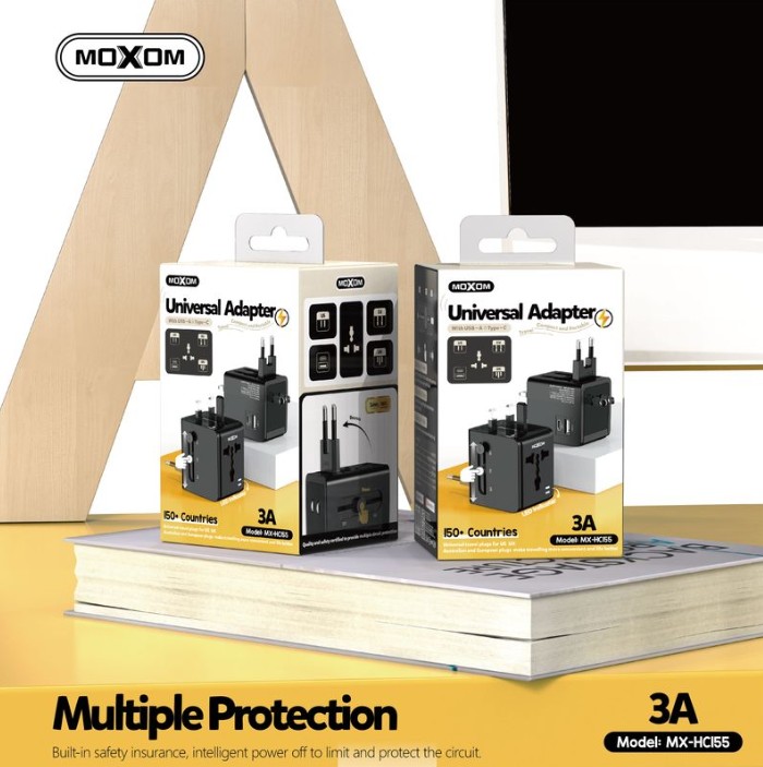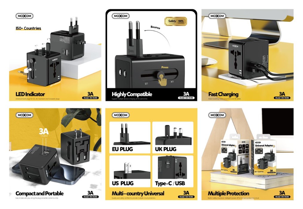 Universal travel adapter with USB and Type-C ports designed for international compatibility, allowing safe and convenient charging for multiple devices worldwide.