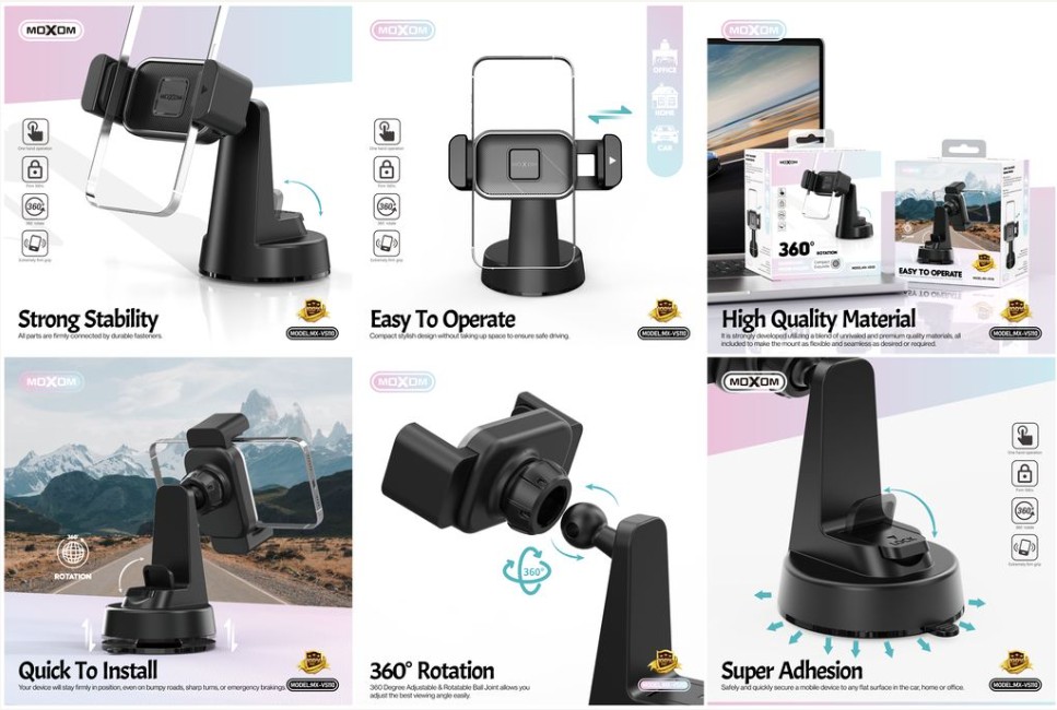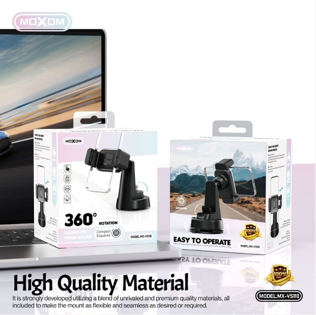 The MOXOM MX-VS110 Dashboard Phone Holder provides a stable and convenient mounting solution for smartphones in vehicles. Designed for dashboard placement, it allows drivers to easily view navigation, take calls, and control music safely.