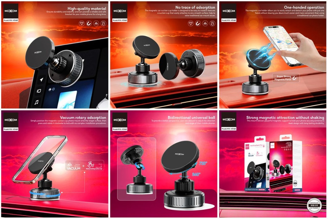 Magnetic vacuum suction cup phone holder with rotating lock mechanism for strong and stable mounting in vehicles.
