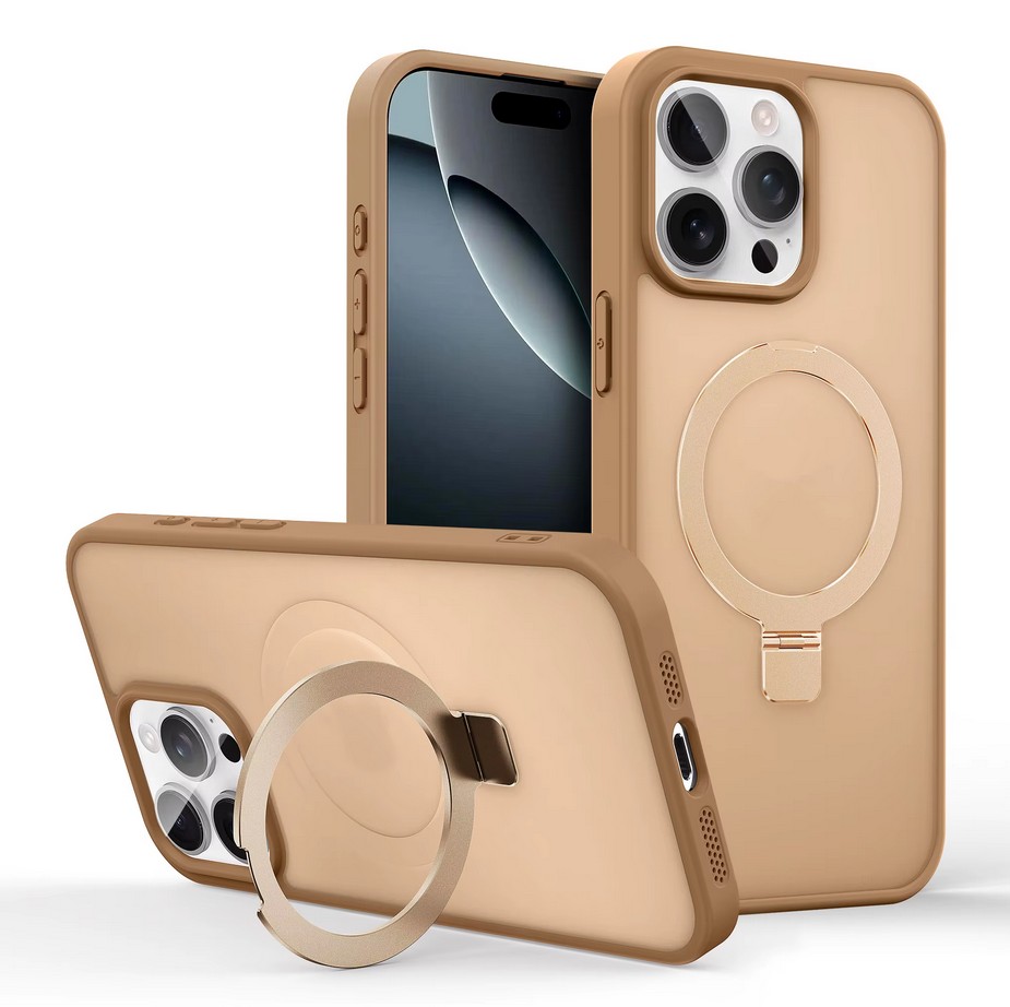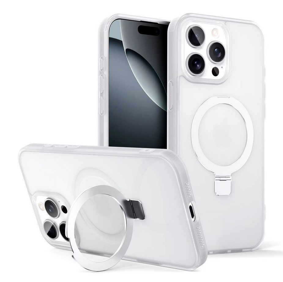 Clear crystal MagSafe case with built-in ring stand for secure grip, hands-free viewing, and magnetic charging support.